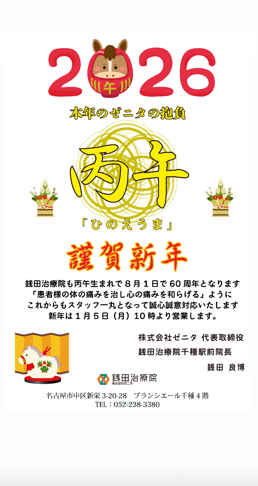 私は毎年、1年の抱負を漢字一字で表現しているのですが、今年は「丙午(ひのえうま)」にさせていただきました。今年は、銭田治療院と私にとっても記念すべき年になりますので、株式会社ゼニタも当然の如く重要な一年になると思います。加えて、一般社団法人日本臨床リカレント教育研究センター(JCREARC; https://jcrearc.jp/)も、今年から本格的に活動を再開させていただくことにいたしました。更には、私が副会長をさせていただいている、一般社団法人日本整形内科学研究会(JNOS; https://www.jnos.or.jp/)では、今年は私が僭越ながら大会長を拝命いたしましたので、準備から運営まで精一杯取り組んでまいります。